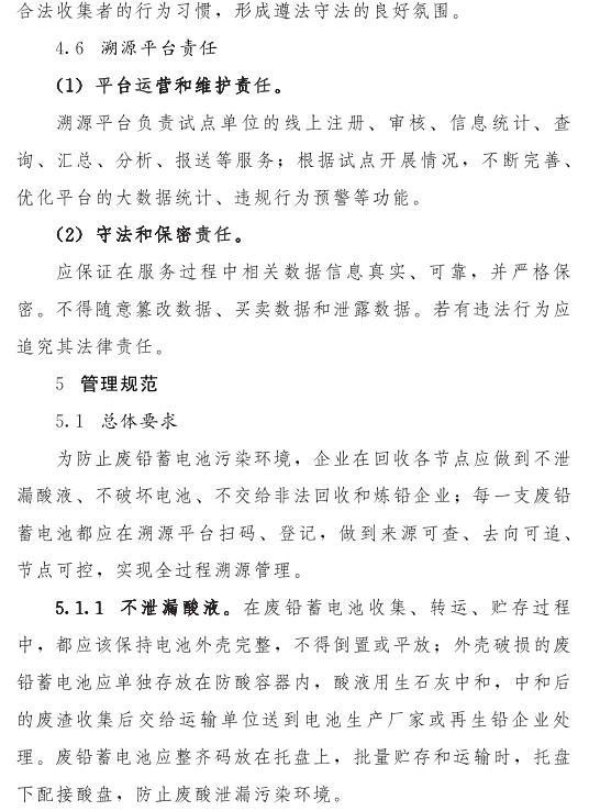 建立廢鉛蓄電池溯源管理平臺(tái),探索廢鉛蓄電池全過程溯源管理模式,實(shí)行廢鉛蓄電池全過程線上信息跟蹤。鉛蓄電池生產(chǎn)企業(yè)、經(jīng)銷商、銷售網(wǎng)點(diǎn)、再生鉛企業(yè)及其回收體系、運(yùn)輸企業(yè)等參與廢鉛蓄電池回收的各責(zé)任主體,要在溯源管理平臺(tái)注冊登記。參與廢鉛蓄電池回收的各責(zé)任主體收到廢鉛蓄電池后及時(shí)粘貼二維碼、掃碼錄入信息,實(shí)現(xiàn)廢鉛蓄電池自產(chǎn)生至再生鉛企業(yè)來源可查、去向可追、全程可控的目標(biāo)。