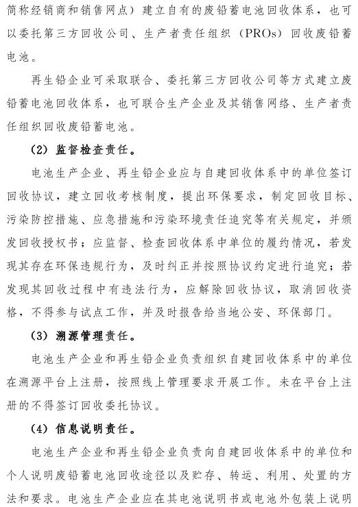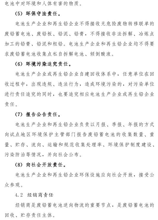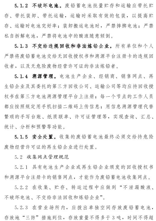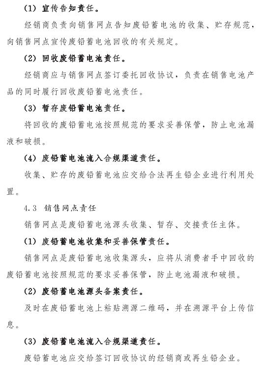 推動(dòng)落實(shí)生產(chǎn)者責(zé)任延伸制度,由鉛蓄電池生產(chǎn)企業(yè)依托自有銷售渠道建立廢鉛蓄電池逆向物流回收體系,持危險(xiǎn)廢物經(jīng)營許可證的再生鉛企業(yè)可通過自主回收、聯(lián)合回收或委托回收等方式建立回收體系。鼓勵(lì)生產(chǎn)企業(yè)和持證企業(yè)進(jìn)行信息溝通和密切合作,以市場為導(dǎo)向,建立穩(wěn)定的商業(yè)交易模式,并采取以舊換新等措施,不斷提高收集處理率。各回收體系收集的廢鉛蓄電池最終須交由具有危險(xiǎn)廢物經(jīng)營許可證的再生鉛企業(yè)利用處置。制定 《廢鉛蓄電池規(guī)范化管理指南》,明確回收體系中各環(huán)節(jié)、各責(zé)任主體責(zé)任及廢鉛蓄電池管理規(guī)范。參與廢鉛蓄電池回收的各責(zé)任主體須嚴(yán)格遵守 《廢鉛蓄電池規(guī)范化管理指南》的各項(xiàng)規(guī)定。
