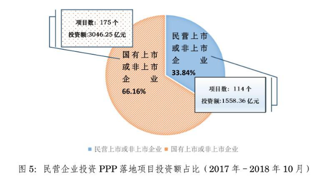 2018年10月,民營企業(yè)以聯(lián)合體牽頭方或者單獨(dú)作為社會資本方落地項(xiàng)目投資額24.41億元。2017年至2018年10月累計(jì)投資額1558.36億元,占33.84%。