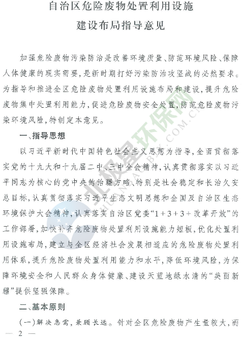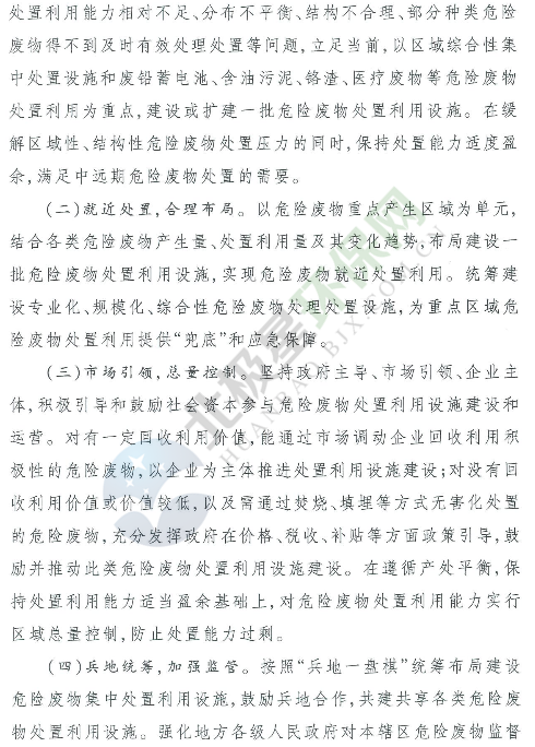《指導意見》根據(jù)全區(qū)危險廢物產(chǎn)生、處置利用現(xiàn)狀和發(fā)展趨勢,以解決急需、兼顧長遠,就近處置、合理布局,市場引領、總量控制,兵地統(tǒng)籌、加強監(jiān)管為基本原則,通過優(yōu)化建設布局,擬用5年左右時間,解決目前全區(qū)危險廢物處置利用能力存在的結(jié)構(gòu)性、布局性和相對不足問題,使全區(qū)危險廢物集中處置利用能力不斷增強,處置利用設施布局趨于合理,基本滿足我區(qū)產(chǎn)生的各類危險廢物安全處置利用的需求,不斷提升全區(qū)危險廢物污染防治水平,降低環(huán)境風險。