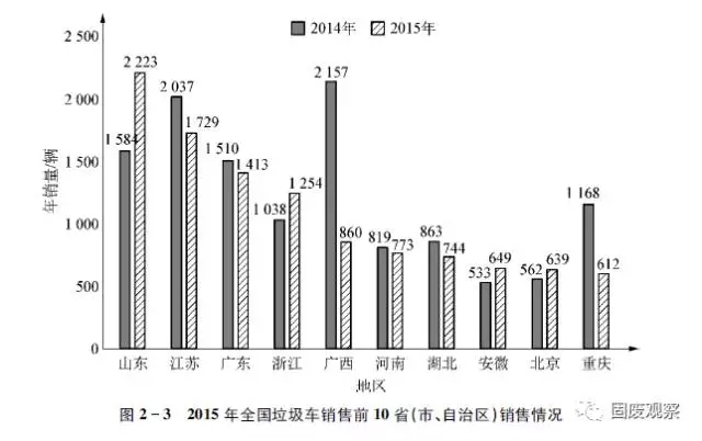 2015年,全國垃圾車銷量前十的省(市、自治區(qū))分別為山東、江蘇、廣東、浙江、廣西、河南、湖北、安徽、北京和重慶等,累計銷量均在600輛以上,銷量合計10896輛。