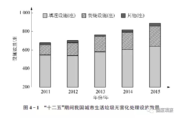 (1)設(shè)施數(shù)量和處理總量不斷增長,填埋技術(shù)仍然占據(jù)絕對主力