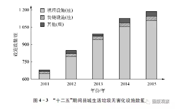 2015年全國縣級行政區(qū)域的無害化處理廠1187座,其中填埋設(shè)施1108座,比2014年新增53座,占全部縣級無害化處理設(shè)施的93.3%,從圖4-3可知,“十二五”期間縣城生活垃圾無害化處理設(shè)施建設(shè)得到快速發(fā)展。