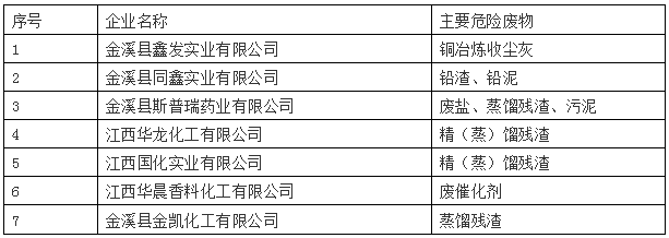金溪縣產(chǎn)生危險(xiǎn)廢物的相關(guān)企業(yè): 為進(jìn)一步規(guī)范危險(xiǎn)廢物管理,建立危險(xiǎn)廢物產(chǎn)生單位信息,根據(jù)各涉危險(xiǎn)廢物企業(yè)增加以及生產(chǎn)經(jīng)營變化等情況,我局對全縣產(chǎn)生危險(xiǎn)廢物監(jiān)管企業(yè)名單進(jìn)行了更新,現(xiàn)予以公布。