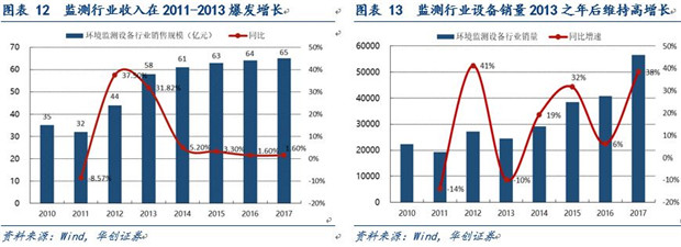 從監(jiān)測(cè)設(shè)備的細(xì)分領(lǐng)域來(lái)看,空氣質(zhì)量監(jiān)測(cè)設(shè)備歷史上經(jīng)歷了兩個(gè)高增長(zhǎng)期,第一次爆發(fā)性增長(zhǎng)為2011-2012年,復(fù)合增速高達(dá)197.3%,第二次出現(xiàn)在2015年,增速為161.7%,這次增長(zhǎng)的主要原因是2016年1月1日后要實(shí)施修訂后的《中華人民共和國(guó)大氣污染防治法》,其中規(guī)定各省大氣污染防治重點(diǎn)任務(wù)完成情況將納入考核,刺激政府需求;此外煙塵煙氣設(shè)備行業(yè)則是從2011年開(kāi)始維持穩(wěn)定的增長(zhǎng)持續(xù)到2017年,期間復(fù)合增長(zhǎng)率14.9%;水質(zhì)監(jiān)測(cè)設(shè)備行業(yè)發(fā)展較晚,在2017年設(shè)備銷量猛增86%,達(dá)到19345套。