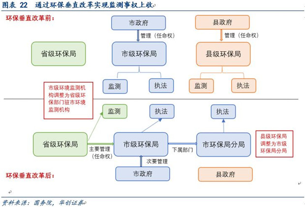 通過(guò)環(huán)保監(jiān)測(cè)垂直改革將環(huán)境監(jiān)測(cè)事權(quán)上收。2016年9月環(huán)保部印發(fā)《關(guān)于省以下環(huán)保機(jī)構(gòu)監(jiān)測(cè)監(jiān)察執(zhí)法垂直管理制度改革試點(diǎn)工作的指導(dǎo)意見(jiàn)》,調(diào)整地方環(huán)境保護(hù)管理體制重新劃定各省市縣的監(jiān)管力量和監(jiān)管責(zé)任,涉及體制結(jié)構(gòu)、經(jīng)費(fèi)保障、人員劃轉(zhuǎn)等多個(gè)方面。通過(guò)垂直管理制度改革實(shí)現(xiàn)環(huán)境監(jiān)測(cè)事權(quán)的上收要求:體制上,省級(jí)環(huán)保部門直接管理市級(jí)環(huán)境監(jiān)測(cè)機(jī)構(gòu),確保生態(tài)環(huán)境質(zhì)量監(jiān)測(cè)數(shù)據(jù)真實(shí)有效;市級(jí)統(tǒng)一管理行政區(qū)域內(nèi)的環(huán)境執(zhí)法力量,依法獨(dú)立行使環(huán)境執(zhí)法權(quán)。保障上,駐市級(jí)環(huán)境監(jiān)測(cè)機(jī)構(gòu)的人財(cái)物管理在省級(jí),縣級(jí)環(huán)保部門的人財(cái)物管理在市級(jí)。人員管理上,縣級(jí)環(huán)保分局領(lǐng)導(dǎo)班子由市級(jí)環(huán)保局直接管理,市級(jí)環(huán)保局領(lǐng)導(dǎo)班子由省級(jí)環(huán)保廳(局)主管。因而能夠有效的克服地方保護(hù)主義,從根源上解決監(jiān)測(cè)數(shù)據(jù)造假的問(wèn)題,提升監(jiān)測(cè)數(shù)據(jù)有效性。