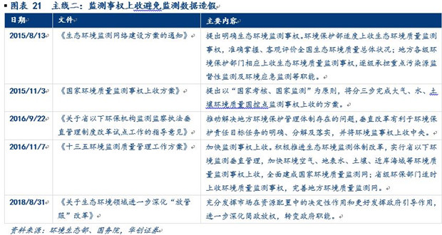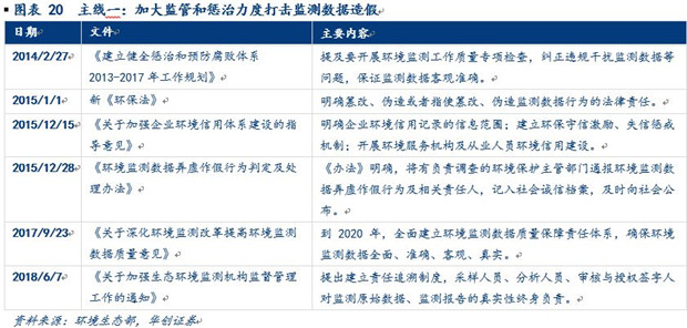 第三階段:政策推動(dòng)集中打擊監(jiān)測(cè)數(shù)據(jù)造假。2015年以來(lái),整體上監(jiān)測(cè)設(shè)備廣泛布局和補(bǔ)充升級(jí)的過(guò)程已經(jīng)基本結(jié)束,后續(xù)增長(zhǎng)有限,實(shí)施執(zhí)行過(guò)程中暴露出篡改、虛報(bào)數(shù)據(jù)等諸多問(wèn)題才是該階段的主要問(wèn)題,因而規(guī)范監(jiān)測(cè)數(shù)據(jù)、打擊數(shù)據(jù)造假成為本階段主題。從政策來(lái)看,打擊數(shù)據(jù)造假的執(zhí)行過(guò)程中有兩條主線:第一條主線貫穿始終,從2015年1月1日《新環(huán)保法》頒布以來(lái),又陸續(xù)出臺(tái)實(shí)施指導(dǎo)意見(jiàn)通過(guò)明確責(zé)任、建立懲罰機(jī)制加大監(jiān)測(cè)數(shù)據(jù)造假的成本,用嚴(yán)監(jiān)管的方式打擊監(jiān)測(cè)數(shù)據(jù)造假;第二條主線則是對(duì)主線一的補(bǔ)充和優(yōu)化,從2015年8月開(kāi)始,通過(guò)監(jiān)測(cè)事權(quán)上收、調(diào)整監(jiān)管體系架構(gòu),從根源上用疏通的方式來(lái)避免監(jiān)測(cè)數(shù)據(jù)造假的問(wèn)題。