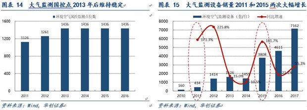 第一階段:建設(shè)監(jiān)測(cè)體系,國(guó)控點(diǎn)、省控點(diǎn)等大型監(jiān)測(cè)設(shè)備廣泛布局。第一階段從2011年開(kāi)始到2013年結(jié)束,首先這是環(huán)境監(jiān)測(cè)行業(yè)在各省市普及化布局監(jiān)測(cè)點(diǎn)位,集中發(fā)展的重要階段。從監(jiān)測(cè)行業(yè)營(yíng)收來(lái)看,行業(yè)銷售規(guī)模從32億元猛增到58億元,兩年內(nèi)的同比增速在30%以上,復(fù)合增速高達(dá)34.6%,而期間監(jiān)測(cè)設(shè)備銷量的增長(zhǎng)率為12.8%,該階段主要由于采購(gòu)的主要為大型監(jiān)測(cè)站,價(jià)值量較高,所以營(yíng)收增速高于設(shè)備銷售增速;隨著2013年大型監(jiān)測(cè)站基本布局完成,大氣監(jiān)測(cè)國(guó)控點(diǎn)的數(shù)目基本穩(wěn)定在1436個(gè),此后監(jiān)測(cè)設(shè)備銷售主要用于補(bǔ)充配置,銷量增速高于行業(yè)營(yíng)收增速。