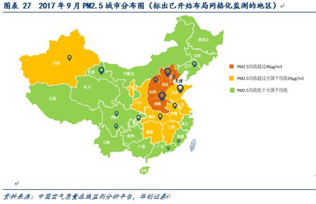 對(duì)各省份污染程度的劃分則依據(jù)2017年9月空氣監(jiān)測(cè)的PM2.5的數(shù)據(jù),劃分重度污染為PM2.5均值超過(guò)40微克的省份/直轄市,包括、河南、河北、山西、天津、北京;中度污染為PM2.5超過(guò)全國(guó)均值的省份,包括山東、江西、湖南、安徽、陜西、江蘇、新疆、湖北、寧夏;輕度污染為PM2.5低于全國(guó)均值的省份,包括廣東、遼寧、廣西、上海、浙江、福建、四川、重慶、內(nèi)蒙古、甘肅、貴州、青海、吉林、黑龍江、云南、西藏、海南。