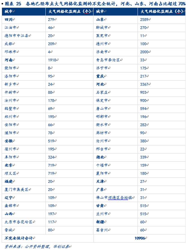 2017 年以來(lái)我國(guó)大氣網(wǎng)格化監(jiān)測(cè)訂單總額超過(guò)7億元,招標(biāo)主體涉及河北、河南、山東、陜西、天津、福建、廣東、廣西、安徽、四川、江蘇、甘肅、湖北、新疆與遼寧這 15 個(gè)省級(jí)行政區(qū),39個(gè)地級(jí)市。經(jīng)不完全統(tǒng)計(jì)全國(guó)大氣網(wǎng)格化監(jiān)測(cè)布點(diǎn)10906個(gè),其中河北、山東、河南布點(diǎn)數(shù)目全國(guó)前三,涉及23個(gè)城市,合計(jì)7874個(gè)點(diǎn)位,占全國(guó)總布點(diǎn)數(shù)目70%以上。而且三大省份已經(jīng)布局的這23個(gè)城市中有18個(gè)都屬于《京津冀及周邊地區(qū)2017年大氣污染防治工作方案》中明確的“2+26”通道城市,其中河北省的8個(gè)通道城市,石家莊、唐山、廊坊、保定、滄州、衡水、邢臺(tái)、邯鄲全部實(shí)現(xiàn)網(wǎng)格化監(jiān)測(cè)覆蓋;山東省的7個(gè)通道城市中,濟(jì)南、濟(jì)寧、德州、聊城已經(jīng)布點(diǎn)并統(tǒng)計(jì)在內(nèi),淄博已經(jīng)完成布點(diǎn)但沒(méi)有準(zhǔn)確數(shù)據(jù),濱州和菏澤在尚布局中;河南省的7個(gè)通道城市中,鄭州、開(kāi)封、安陽(yáng)、鶴壁、新鄉(xiāng)、濮陽(yáng)已經(jīng)完成布點(diǎn),只有焦作尚在布局中。外加北京、天津、山西省的太原和晉城也完成網(wǎng)格監(jiān)測(cè)點(diǎn)布局,“2+26”城市中有22個(gè)已經(jīng)布點(diǎn),基本實(shí)現(xiàn)了城市的覆蓋,但從布點(diǎn)數(shù)量來(lái)看河北廊坊市、山東濟(jì)寧市、聊城市、河南省各市以及天津只是剛剛開(kāi)始,這些城市離布局完成還有近80%的空間。