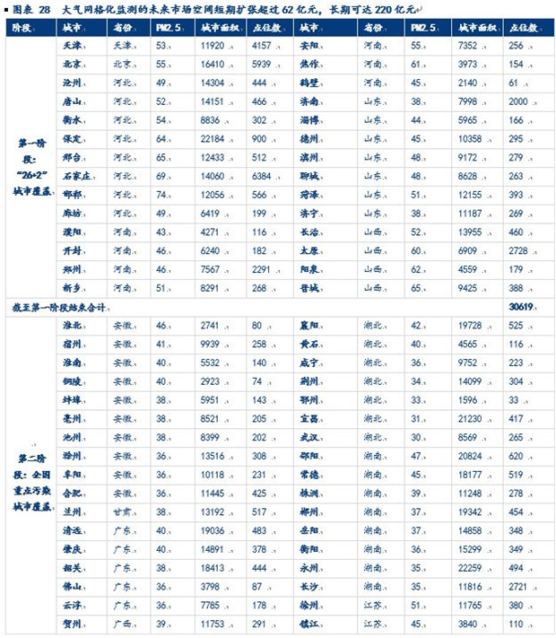 大氣網(wǎng)格化監(jiān)測(cè)布點(diǎn)從“26+2”城市開(kāi)始,并從重污染地區(qū)向輕污染地區(qū)延伸的拓展,直到覆蓋全國(guó)。第一階段是“26+2”城市覆蓋階段,預(yù)計(jì)總共布點(diǎn)約30619個(gè),形成30億左右的市場(chǎng);第二階段是全國(guó)重點(diǎn)污染城市覆蓋階段,預(yù)計(jì)點(diǎn)位91943個(gè),市場(chǎng)空間擴(kuò)張到92億元;第三階段是全國(guó)337個(gè)地級(jí)市全覆蓋階段,預(yù)計(jì)點(diǎn)位220758個(gè),市場(chǎng)空間超過(guò)220億元。