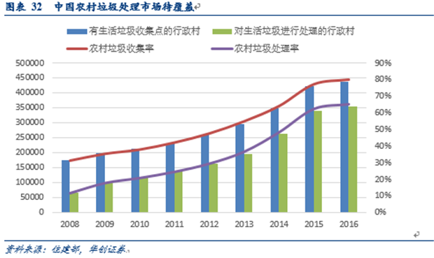 2016年,國(guó)務(wù)院印發(fā)的《“十三五”生態(tài)環(huán)境保護(hù)規(guī)劃》提出的目標(biāo):實(shí)現(xiàn)90%以上村莊的生活垃圾得到有效治理,推進(jìn)垃圾處理設(shè)施和服務(wù)向農(nóng)村延伸,新增完成對(duì)13萬(wàn)個(gè)建制村完成環(huán)境綜合整治。