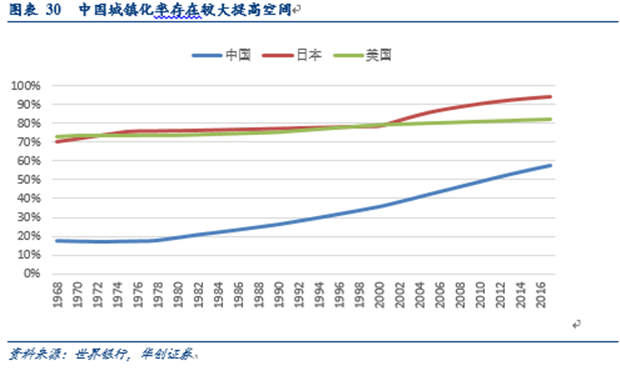 對(duì)比發(fā)達(dá)國(guó)家,我國(guó)城鎮(zhèn)化率仍有較大的差距。2017年,我國(guó)城鎮(zhèn)化率僅為58.52%,與發(fā)達(dá)國(guó)家普遍80%以上的城鎮(zhèn)化率相比,提高空間較大。