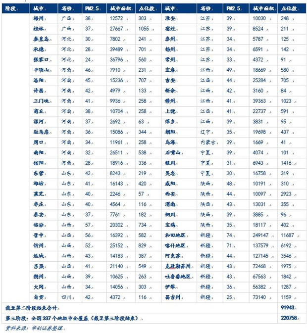 第二階段是全國(guó)重點(diǎn)污染城市覆蓋階段,覆蓋①重度污染省份的所有地級(jí)市②中度污染省份中污染程度前50%的所有地級(jí)市③所有PM2.5(從大到?。┡琶耙话俚某鞘校?/p>