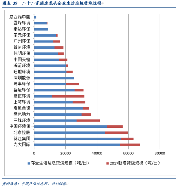 從處理能力來(lái)看,行業(yè)整體較為分散,但增速較快,2017 年二十二家固廢龍頭企業(yè)新增生活垃圾焚燒總規(guī)模 119421噸/日,增速約23%。