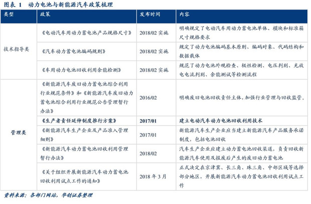 新能源汽車政策是近年新能源汽車發(fā)展的重要風(fēng)向標(biāo),一方面,十三五規(guī)劃從頂層對(duì)新能源汽車的發(fā)展指出方向,另一方面,針對(duì)產(chǎn)品準(zhǔn)入、電池供應(yīng)、充電基礎(chǔ)設(shè)施、能耗管理和補(bǔ)貼等做出了明確要求。而隨著動(dòng)力電池即將步入報(bào)廢期,2017年以來(lái)針對(duì)動(dòng)力電池技術(shù)規(guī)范、管理等方面推出了一系列政策,尤其是2018年2月以來(lái)對(duì)動(dòng)力電池的規(guī)格尺寸、編碼、余能監(jiān)測(cè)等技術(shù)規(guī)范的統(tǒng)一將進(jìn)一步推動(dòng)梯次利用等回收手段的高效應(yīng)用。