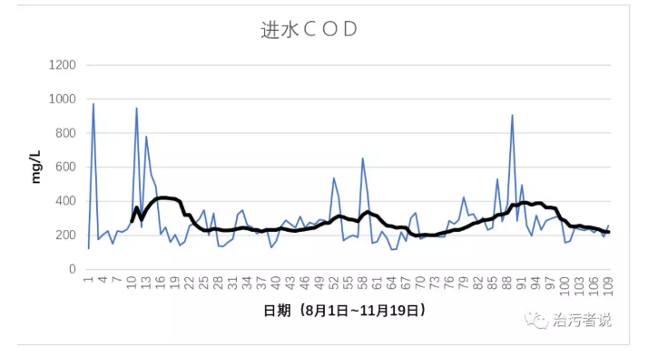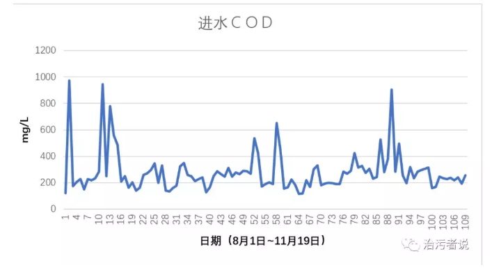 首先對(duì)工藝人員懷疑的進(jìn)水COD進(jìn)行分析,通過表格軟件對(duì)進(jìn)水的COD進(jìn)行曲線分析可以看到進(jìn)水的COD變化情況。