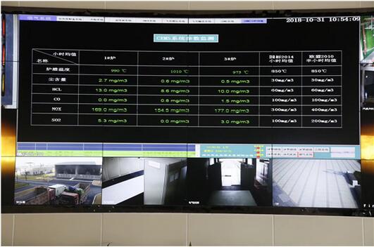 2018年10月31日上午,萬里行記者在紹興市垃圾焚燒發(fā)電廠中控室拍下該廠3臺正在運行的焚燒爐煙氣中污染物的實測數(shù)據(jù),這些數(shù)據(jù)全部達(dá)到我國《生活垃圾焚燒污染控制標(biāo)準(zhǔn)》(GB18485-2014)的小時均值和《歐盟工業(yè)排放指令》(2010/75/EC)的半小時均值要求。比如:1號焚燒爐,爐溫為990℃,塵含量為2.7毫克/立方米,HCl為13毫克/立方米,CO為0毫克/立方米,NOX為169毫克/立方米,SO2為5.3毫克/立方米,都大大優(yōu)于2014國標(biāo)和2010歐盟標(biāo)準(zhǔn)。記者又來到廠區(qū)大門,看到湛藍(lán)的天空下一塊巨大的LED屏實時公布了污染物排放的實測數(shù)據(jù)。