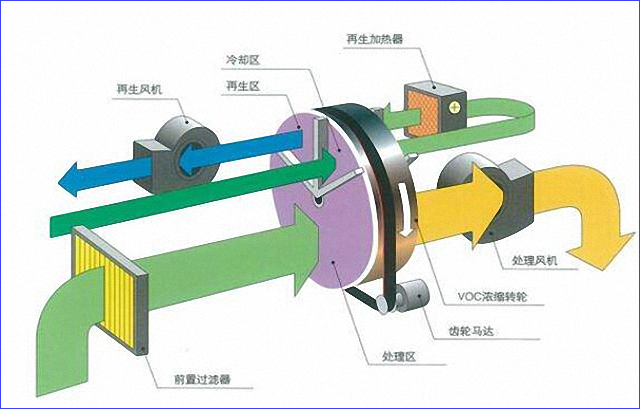 RTO系統(tǒng)的核心組成部分——沸石輪轉(zhuǎn)濃縮機(jī)(RC),可以分為處理區(qū)、再生區(qū)、冷卻區(qū)。含有VOC的被處理空氣通過過濾器后,送到濃縮轉(zhuǎn)輪的處理區(qū),VOC被吸附除去;吸附于濃縮轉(zhuǎn)輪的凈化后的空氣在再生區(qū)經(jīng)熱風(fēng)處理被脫附濃縮;濃縮轉(zhuǎn)卻在冷卻區(qū)被冷卻,經(jīng)過冷卻后的空氣,再經(jīng)加熱后作為再生空氣使用。