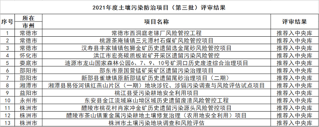 湖南省生態(tài)環(huán)境廳關(guān)于2021年度土壤污染防治項(xiàng)目(第三批)、地下水污染防治項(xiàng)目(第二批)評(píng)審結(jié)果的公示 根據(jù)《土壤污染防治專項(xiàng)資金管理辦法》、《關(guān)于印發(fā)<中央生態(tài)環(huán)境資金項(xiàng)目儲(chǔ)備庫入庫指南>的通知》、《湖南省省級(jí)財(cái)政專項(xiàng)資金公開辦法(試行)》等有關(guān)要求,經(jīng)項(xiàng)目單位申請(qǐng)、市級(jí)環(huán)保部門審查、...