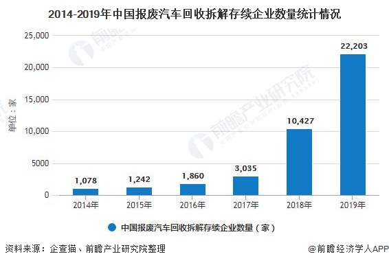 1、中國(guó)報(bào)廢汽車回收拆解存續(xù)企業(yè)數(shù)量猛增 近兩年,我國(guó)報(bào)廢汽車回收拆解存續(xù)企業(yè)數(shù)量猛增。據(jù)企查貓數(shù)據(jù)顯示,2019年,我國(guó)報(bào)廢汽車回收拆解存續(xù)企業(yè)數(shù)量共22203家,較2018年大幅增長(zhǎng)。 2015-2019年,我國(guó)報(bào)廢機(jī)動(dòng)車回收數(shù)量波動(dòng)變化。據(jù)商務(wù)部市場(chǎng)體系建設(shè)司統(tǒng)計(jì)數(shù)據(jù)顯示,2019年,我國(guó)報(bào)廢...