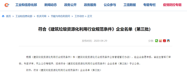 日前,工信部發(fā)布符合《建筑垃圾資源化利用行業(yè)規(guī)范條件》企業(yè)名單(第三批)。共涉及五家企業(yè)。 中華人民共和國(guó)工業(yè)和信息化部 中華人民共和國(guó)住房和城鄉(xiāng)建設(shè)部公告 2020年 第14號(hào) 根據(jù)《建筑垃圾資源化利用行業(yè)規(guī)范條件》和《建筑垃圾資源化行業(yè)規(guī)范條件公告管理暫行辦法》,經(jīng)企業(yè)自愿申報(bào)、省級(jí)主管部門(mén)審核...