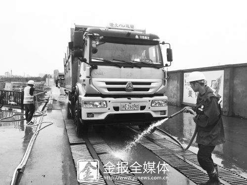 每輛運(yùn)輸車駛出工地出口前,先要從過(guò)水池過(guò)水,在過(guò)水池中接受自動(dòng)噴淋全方位沖洗,再駛?cè)霙_洗平臺(tái),工人用高壓水槍,對(duì)輪胎、車廂凹槽、縫隙等部位再次沖洗,確保車輛凈車出場(chǎng)。9月15日,記者在位于市區(qū)東市街與宋濂路交叉口的多湖商務(wù)區(qū)塊某工程施工現(xiàn)場(chǎng)看到了上述一幕?!拔覀円筮@樣做的目的,是為了防止車污染城市...
