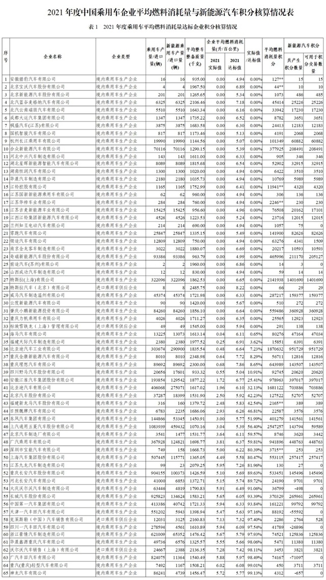 2021年度中國(guó)乘用車(chē)企業(yè)平均燃料消耗量與新能源汽車(chē)積分情況公告