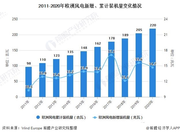 1、歐洲風(fēng)電裝機(jī)量不斷提升 早在20世紀(jì)90年代初,歐盟就提出了大力發(fā)展風(fēng)電的計(jì)劃和目標(biāo),發(fā)展至今,風(fēng)電已成歐洲最廉價(jià)發(fā)電模式。數(shù)據(jù)顯示,2011-2020年,歐洲風(fēng)電累計(jì)裝機(jī)量由98吉瓦增長(zhǎng)至220吉瓦,同時(shí)每年新增裝機(jī)量也不斷提升。2020年,歐洲新增風(fēng)電裝機(jī)14.7兆瓦,受疫情影響較2019年...