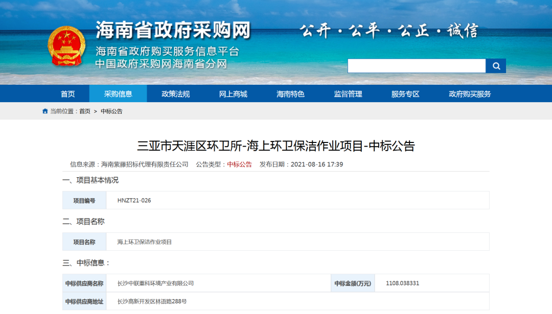 海南省政府采購網(wǎng)消息,8月15日,三亞市天涯區(qū)環(huán)衛(wèi)所海上環(huán)衛(wèi)保潔作業(yè)項目公布中標結果,盈峰環(huán)境子公司長沙中聯(lián)重科環(huán)境產業(yè)有限公司以,中標結果如下:中標供應商名稱:長沙中聯(lián)重科環(huán)境產業(yè)有限公司中標金額:1108.038331(萬元) /年服務期限:3年服務內容:海域保潔、沙灘保潔、河面保潔、護坡保潔、...
