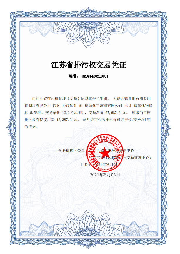 近日,德納化工濱海有限公司與無(wú)錫西姆萊斯石油專用管制造有限公司通過(guò)省排污權(quán)交易平臺(tái)成功完成一筆跨設(shè)區(qū)市排污權(quán)交易,無(wú)錫西姆萊斯石油專用管制造有限公司以12240元/噸的價(jià)格,將富余氮氧化物排污權(quán)指標(biāo)出讓給德納化工濱海有限公司,成交價(jià)是政府設(shè)定基準(zhǔn)價(jià)的5倍以上,創(chuàng)下新高。 交易期間,兩家公司通過(guò)省排污...