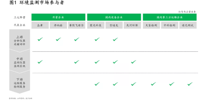 競(jìng)爭(zhēng)現(xiàn)狀 當(dāng)前環(huán)境監(jiān)測(cè)行業(yè)主要分為三大陣營(yíng),分別是外資企業(yè)、國(guó)內(nèi)設(shè)備企業(yè)及國(guó)內(nèi)第三方運(yùn)維企業(yè)(如圖1)。外資企業(yè)的業(yè)務(wù)重心在上游,包括監(jiān)測(cè)所用到的分析儀器、監(jiān)測(cè)儀器的關(guān)鍵部件等;國(guó)內(nèi)設(shè)備企業(yè)的業(yè)務(wù)重心在中游,包括集成化的監(jiān)測(cè)儀器、監(jiān)測(cè)系統(tǒng)等,但有些企業(yè)正逐漸向上下游延伸,提供全產(chǎn)業(yè)鏈服務(wù);國(guó)內(nèi)第三方...