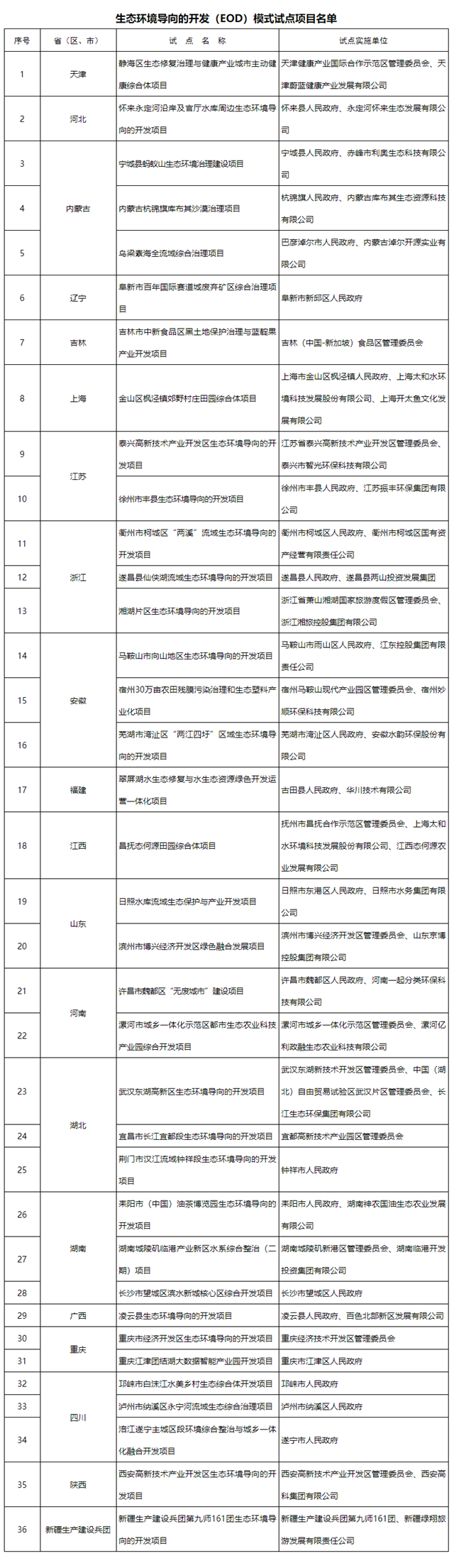 關(guān)于同意開展生態(tài)環(huán)境導(dǎo)向的開發(fā)(EOD)模式試點(diǎn)的通知天津市、河北省、內(nèi)蒙古自治區(qū)、遼寧省、吉林省、上海市、江蘇省、浙江省、安徽省、福建省、江西省、山東省、河南省、湖北省、湖南省、廣西壯族自治區(qū)、重慶市、四川省、陜西省、新疆生產(chǎn)建設(shè)兵團(tuán)生態(tài)環(huán)境廳(局)、發(fā)展改革委,國家開發(fā)銀行有關(guān)分行,各試點(diǎn)實(shí)施單...