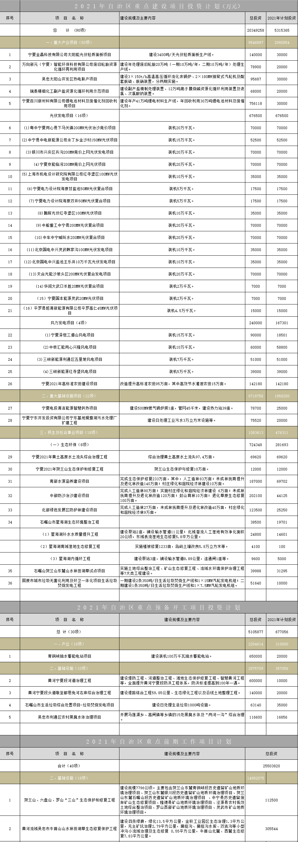 2021年4月7日,寧夏發(fā)布《2021年自治區(qū)重點項目投資計劃》。 重點項目投資計劃共計90項,總投資2034.9258億元,2021年度計劃投資531.5365億元;重點預備開工項目共計30項,總投資510.5877億元,2021年度計劃投資67.7056億元;重點前期工作項目共計40項,總投資2...