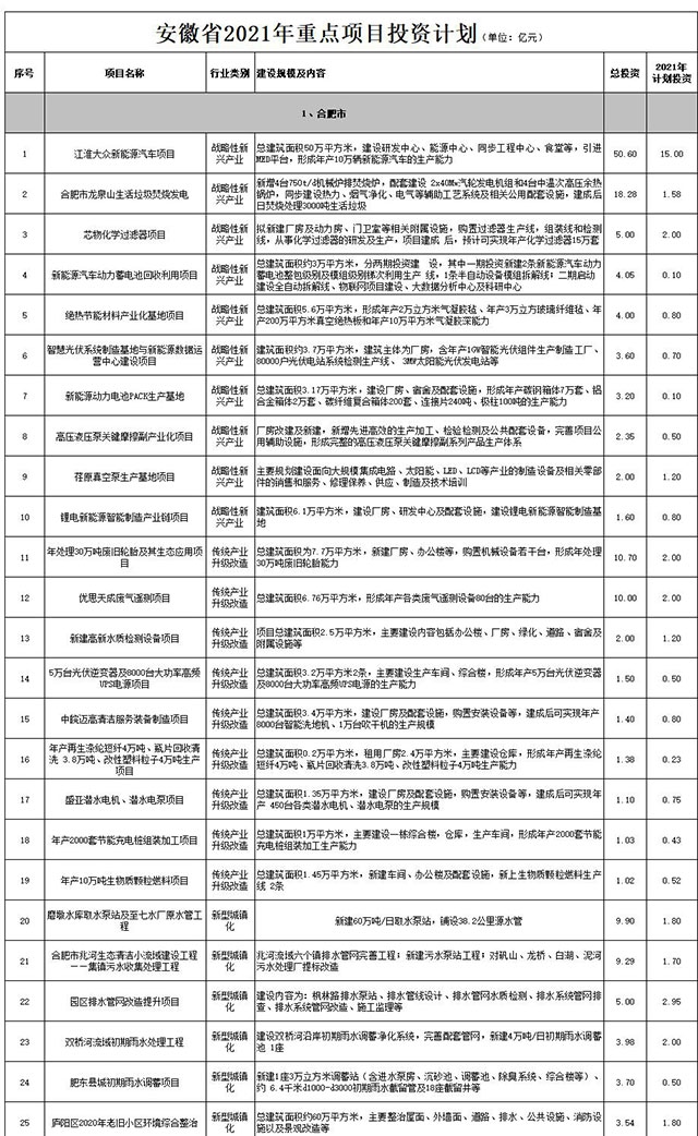 2021年2月26日, 安徽省人民政府發(fā)布《2021年重點項目投資計劃》,合計7851個。 生態(tài)環(huán)保類別有286個: 1、十五里河流域治理一期工程項目 2、資源循環(huán)利用及生態(tài)處置項目 3、肥東十八聯(lián)圩生態(tài)濕地項目 4、新站區(qū)少荃湖綜合治理工程項目 5、鐘油坊社區(qū)人居綜合環(huán)境整治項目 6、南淝河下游環(huán)...