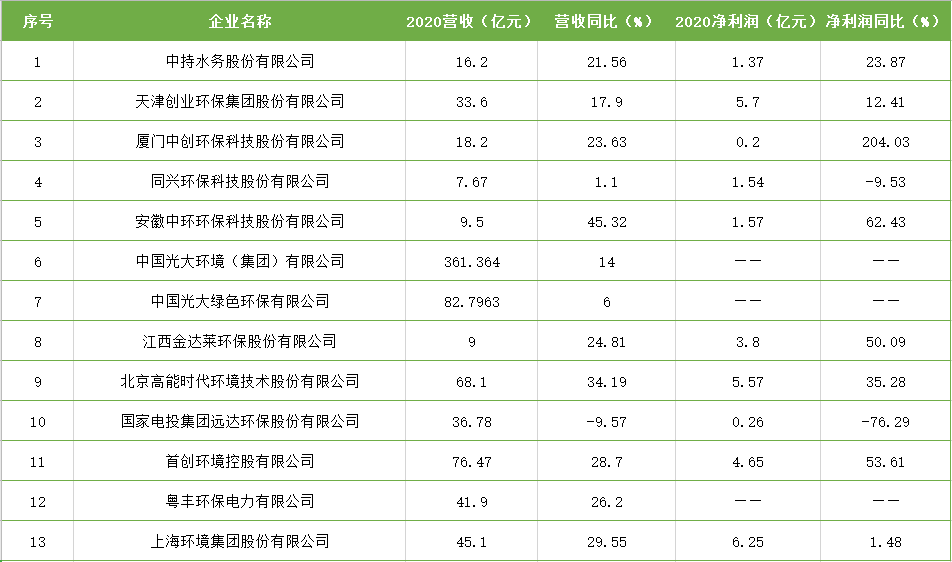目前,已經(jīng)陸陸續(xù)續(xù)有環(huán)保上市企業(yè)發(fā)布2020年業(yè)績報告了,來看一下各自的盈虧情況。 一、中持水務(wù)股份有限公司 2020年度營收為1,624,993,819.3元(16.2億元),同比增長21.56%;凈利潤為137,630,805.46元(1.37億元),同比增長23.87%;歸屬于上市公司股東的扣...