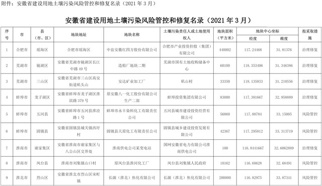 依據(jù)《中華人民共和國(guó)土壤污染防治法》和《污染地塊土壤環(huán)境管理辦法(試行)》,結(jié)合近期建設(shè)用地土壤污染狀況調(diào)查評(píng)估、風(fēng)險(xiǎn)管控和治理修復(fù)等情況,省生態(tài)環(huán)境廳會(huì)同自然資源廳對(duì)《安徽省建設(shè)用地土壤污染風(fēng)險(xiǎn)管控和修復(fù)名錄(2021年2月)》進(jìn)行了動(dòng)態(tài)更新,形成《安徽省建設(shè)用地土壤污染風(fēng)險(xiǎn)管控和修復(fù)名錄(202...
