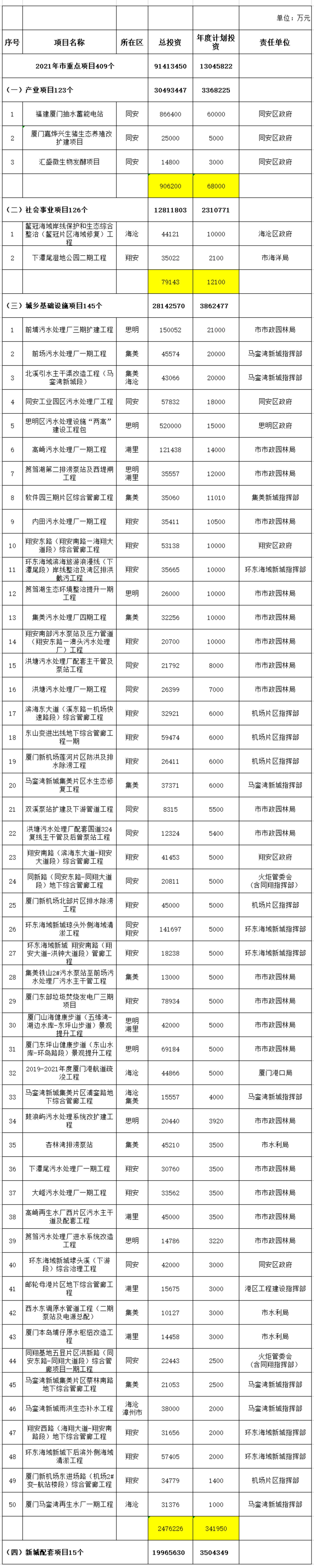 2021年1月15日,廈門公開2021年重點(diǎn)項(xiàng)目名單。 2021年市重點(diǎn)項(xiàng)目409個(gè),項(xiàng)目總投資9141.35億元,年度計(jì)劃投資1304.58億元;其中:產(chǎn)業(yè)項(xiàng)目123個(gè),年度計(jì)劃投資336.82億元;社會(huì)事業(yè)項(xiàng)目126個(gè),年度計(jì)劃投資231.08億元;城鄉(xiāng)基礎(chǔ)設(shè)施項(xiàng)目145個(gè),年度計(jì)劃投資386....