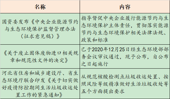 政策 國資委:中央企業(yè)能源節(jié)約與生態(tài)環(huán)境保護(hù)監(jiān)督管理辦法(征求意見稿) 生態(tài)環(huán)境部:關(guān)于廢止固體廢物進(jìn)口相關(guān)規(guī)章和規(guī)范性文件的決定 河北印發(fā)通知:及時(shí)清運(yùn)生活垃圾 嚴(yán)禁居民隨意翻撿 企業(yè) 遠(yuǎn)達(dá)環(huán)保2020年凈利預(yù)降76%左右 金達(dá)萊2020年業(yè)績預(yù)增五成 在手訂單超11億元經(jīng)營穩(wěn)健向好 15.3億!...