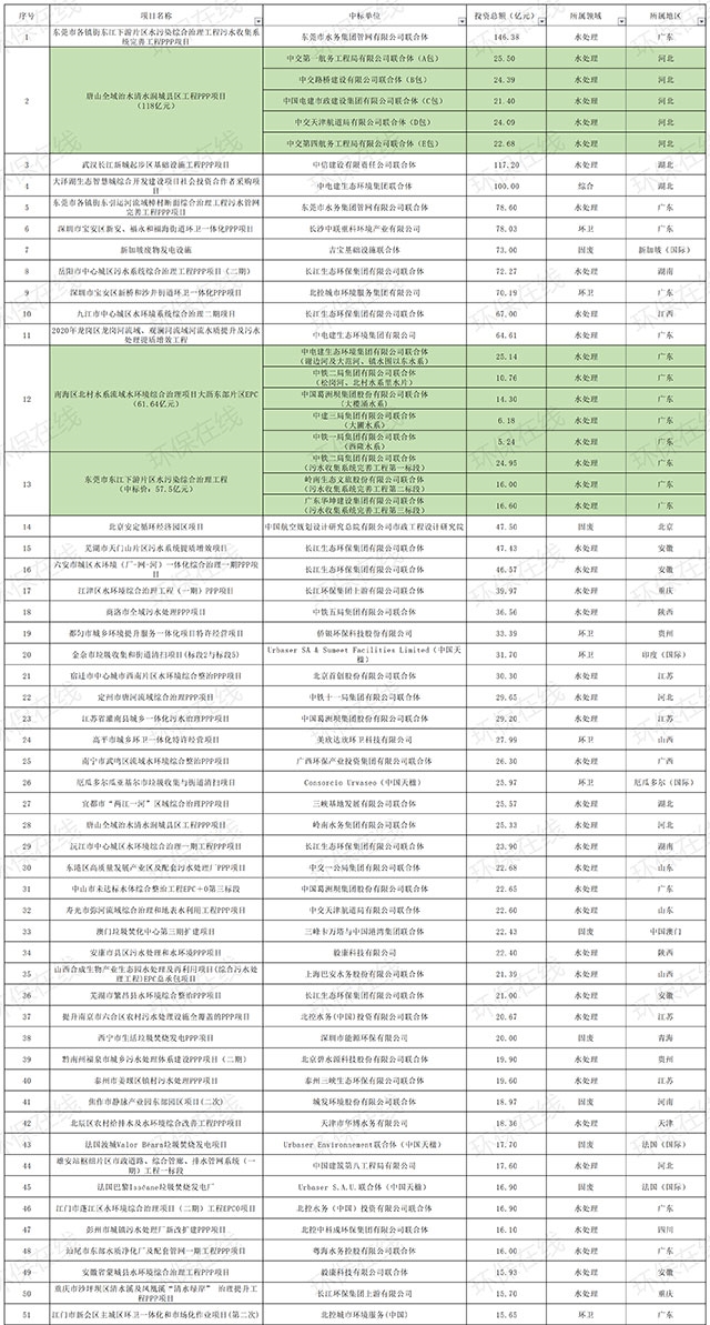 本文整理了2020年289項(xiàng)億元以上的中標(biāo)項(xiàng)目,投資總額達(dá)到3161.79億元。 其中,超過百億的中標(biāo)項(xiàng)目有4個(gè),分別為東莞市各鎮(zhèn)街東江下游片區(qū)水污染綜合治理工程污水收集系統(tǒng)完善工程PPP項(xiàng)目(146.38億元)、唐山全域治水清水潤城縣區(qū)工程PPP項(xiàng)目(5個(gè)標(biāo)段共計(jì)118億元)、武漢長江新城起步區(qū)基...