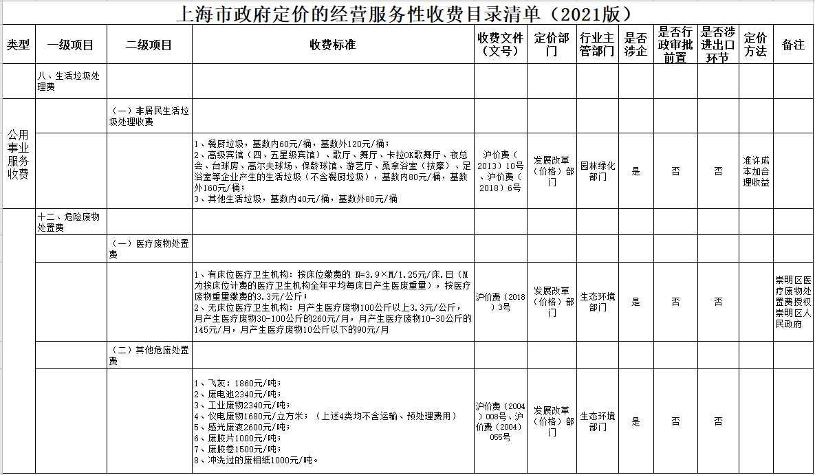 《上海市政府定價的經營服務性收費目錄清單(2021版)》印發(fā): 與2020版相比,非居民生活垃圾處理收費標準和危廢處置收費標準沒有變化。 除了這些收費外,上海2019年度行政事業(yè)性收費目錄清單中顯示: 簡單羅列一下,上海市非居民生活垃圾處理收費,餐廚垃圾60或120元/桶;高級賓館(四、五星級賓館)...