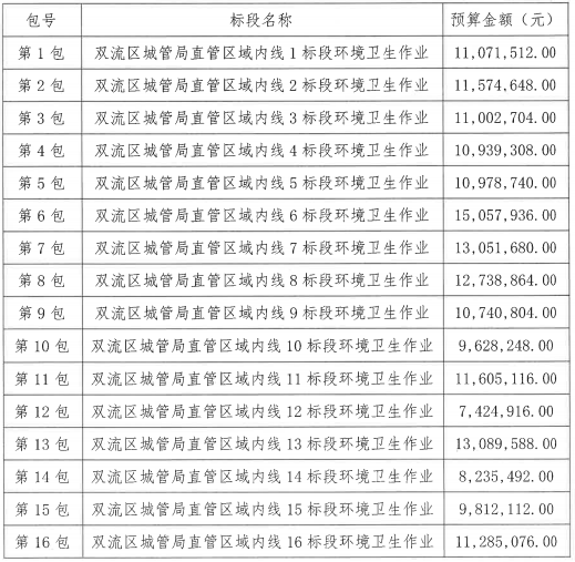 成都市雙流區(qū)城市管理局擬對“成都市雙流區(qū)城市管理局直管區(qū)域(內(nèi)線)環(huán)衛(wèi)作業(yè)采購項目”進行采購。據(jù)了解,此輪采購將直管公廁管理和直管區(qū)域生活垃圾前端清運與環(huán)衛(wèi)清掃保潔作業(yè)一并服務(wù)外包。 服務(wù)共分為16個標段,擬通過公開招標方式確定16名中標人提供環(huán)衛(wèi)作業(yè)相關(guān)服務(wù)。項目總預(yù)算為1...