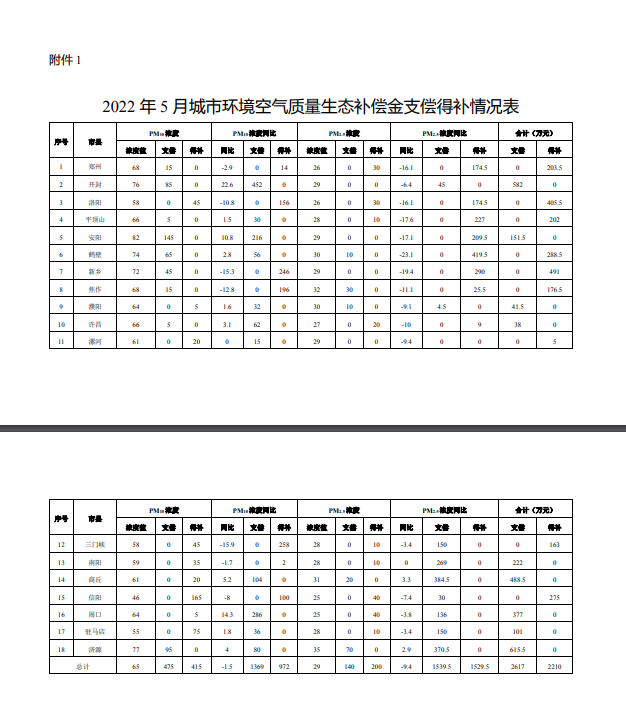 根據(jù)《河南省污染防治攻堅(jiān)戰(zhàn)領(lǐng)導(dǎo)小組辦公室關(guān)于印發(fā)河南省城市環(huán)境空氣質(zhì)量生態(tài)補(bǔ)償辦法(試行)等辦法的通知》(豫環(huán)攻堅(jiān)辦〔2020〕15號(hào))要求,河南省生態(tài)環(huán)境廳廳對(duì)各省轄市的城市環(huán)境空氣質(zhì)量生態(tài)補(bǔ)償金的支償、得補(bǔ)情況進(jìn)行了計(jì)算。截止2022年5月,各省轄市共支償城市環(huán)境空氣質(zhì)量生態(tài)補(bǔ)償金2617萬元,...