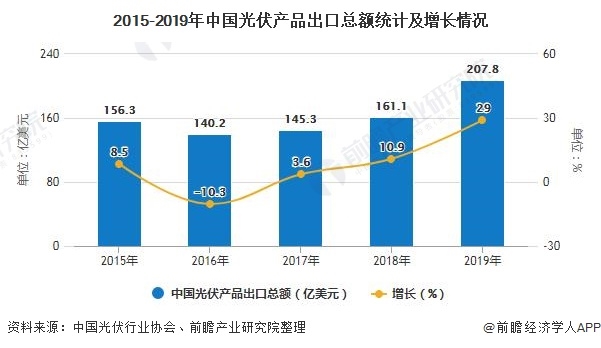 光伏產(chǎn)品產(chǎn)量不降反增拉動(dòng)光伏設(shè)備投資繼續(xù)增長(zhǎng) 2019年盡管受政策調(diào)整影響,中國(guó)市場(chǎng)有所下滑,但產(chǎn)品價(jià)格的快速下滑使光伏發(fā)電在越來(lái)越多的國(guó)家具備成本競(jìng)爭(zhēng)力,從而導(dǎo)致全球光伏市場(chǎng)快速發(fā)展,光伏產(chǎn)品產(chǎn)量不降反增,進(jìn)而拉動(dòng)光伏設(shè)備投資繼續(xù)增長(zhǎng)。 1、2019年中國(guó)光伏產(chǎn)品出口總額再次突破200億美元 從技...