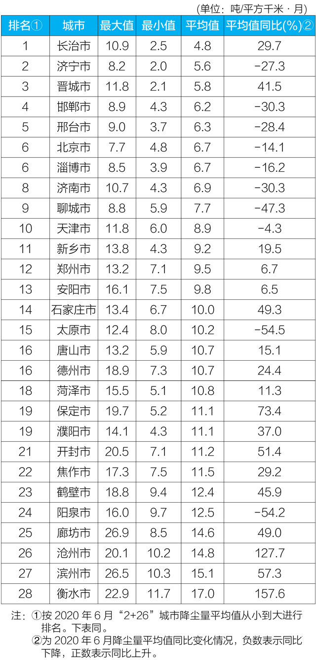 生態(tài)環(huán)境部今日向媒體公布了2020年6月京津冀大氣污染傳輸通道“2+26”城市(以下簡(jiǎn)稱(chēng)“2+26”城市)和汾渭平原11城市降塵監(jiān)測(cè)結(jié)果。 一、“2+26”城市 6月,“2+26”城市降塵量均值范圍在4....