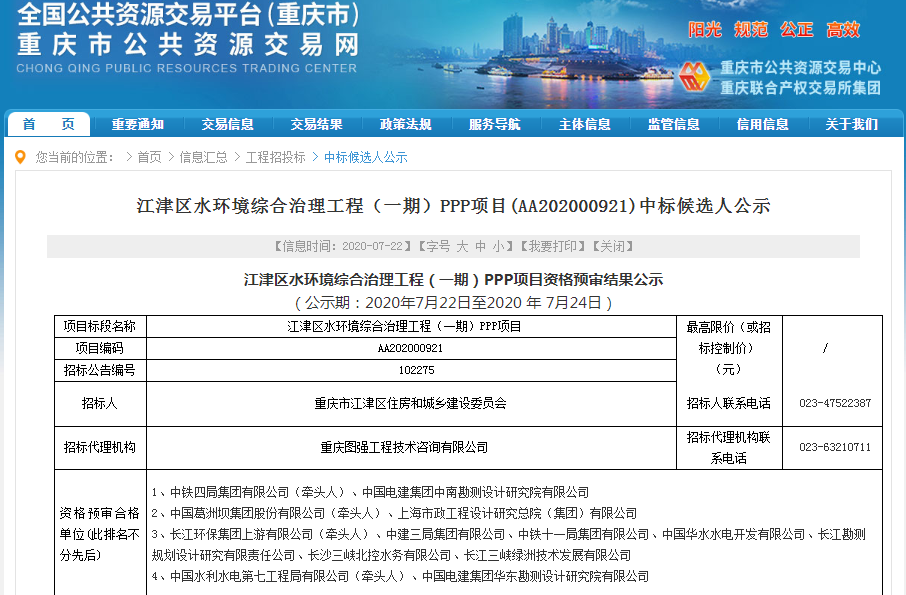 近日,重慶市江津區(qū)水環(huán)境綜合治理工程(一期)PPP項(xiàng)目資格預(yù)審結(jié)果公布,共4家聯(lián)合體入圍,分別是: 1、中鐵四局集團(tuán)有限公司(牽頭人)、中國(guó)電建集團(tuán)中南勘測(cè)設(shè)計(jì)研究院有限公司 2、中國(guó)葛洲壩集團(tuán)股份有限公司(牽頭人)、上海市政工程設(shè)計(jì)研究總院(集團(tuán))有限公司 3、長(zhǎng)江環(huán)保集團(tuán)上游有限公司(牽頭人)、...