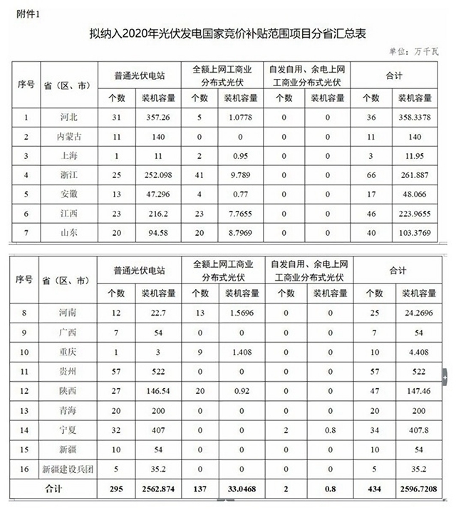 近日,國(guó)家能源局發(fā)布2020年光伏發(fā)電項(xiàng)目國(guó)家補(bǔ)貼競(jìng)價(jià)結(jié)果,其中顯示,河北、內(nèi)蒙古等15個(gè)省(區(qū)、市)和新疆生產(chǎn)建設(shè)兵團(tuán)的434個(gè)項(xiàng)目納入2020年國(guó)家競(jìng)價(jià)補(bǔ)貼范圍,總裝機(jī)容量2596.7208萬(wàn)千瓦。 國(guó)家能源局綜合司關(guān)于公布2020年光伏發(fā)電項(xiàng)目國(guó)家補(bǔ)貼競(jìng)價(jià)結(jié)果的通知 各省(自治區(qū)、直轄市)和新...