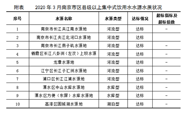 一、監(jiān)測情況 2020年3月,江蘇省南京環(huán)境監(jiān)測中心監(jiān)測10個區(qū)縣級以上在用集中式生活飲用水水源,均屬于地表水水源(河流型7個,湖庫型3個)。 (一)監(jiān)測點位 1.河流型水源:分別在南京市長江夾江南水源地、南京市長江夾江北河口水源地、南京市長江燕子磯水源地、棲霞區(qū)長江八卦洲(左汊)上壩水源地、龍?zhí)端?..