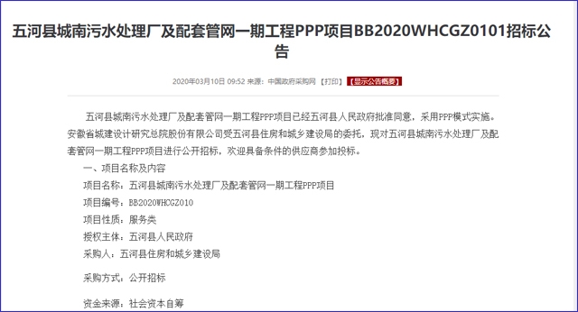 截圖源于中國(guó)采購(gòu)網(wǎng) 源于中國(guó)政府采購(gòu)網(wǎng)日前報(bào)道,擬采用PPP模式的安徽五河縣城南污水處理廠及配套管網(wǎng)一期工程項(xiàng)目(編號(hào):BB2020WHCGZ010)發(fā)布招標(biāo)公告。 占地約88畝,該項(xiàng)目五河縣城東南部。當(dāng)前,五河縣污水處理廠該廠分兩期建設(shè),一期工程已于 2007 年建成投產(chǎn),規(guī)模為 2.5 萬(wàn) m&...