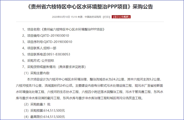 截圖源于中國(guó)政府采購(gòu)網(wǎng) 源于中國(guó)政府采購(gòu)網(wǎng)3月10日公開(kāi)消息,采購(gòu)預(yù)算高達(dá)614513500元的貴州省六枝特區(qū)中心區(qū)水環(huán)境整治PPP項(xiàng)目(編號(hào):QXTD-2019030010)發(fā)布采購(gòu)公告。 本次項(xiàng)目設(shè)計(jì)為六枝河中心城區(qū)水環(huán)境治理,整治流域總長(zhǎng)為24.2公里,其中六枝河主流9.2公里,六枝河枝流15...